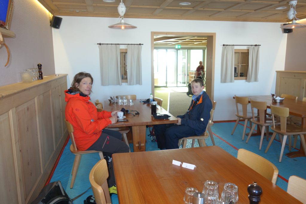 Vätskepaus och en summering av terrängen och snölagret som har fallit de senaste dagarna. Det tar på krafterna för det är 30-50 cm lössnö på det förra lagret.